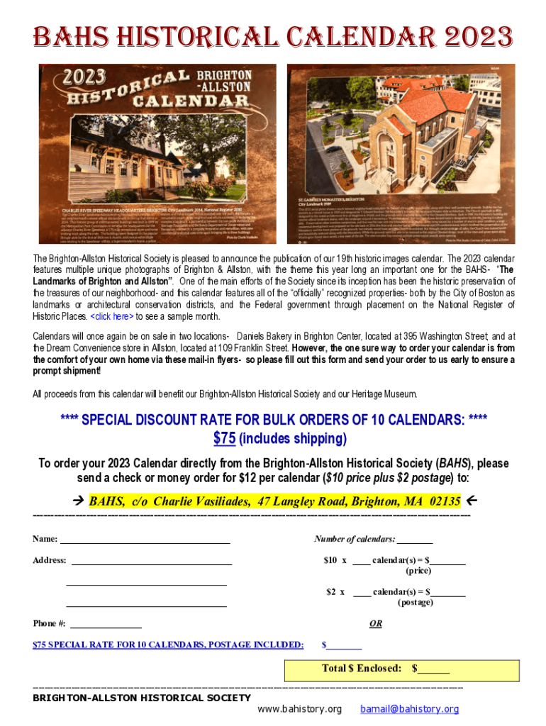BASS HISTORICAL CALENDAR 2023The BrightonAllston Historical Society is pleased to announce the publication of our 19th historic images calendar. The 2023 calendar