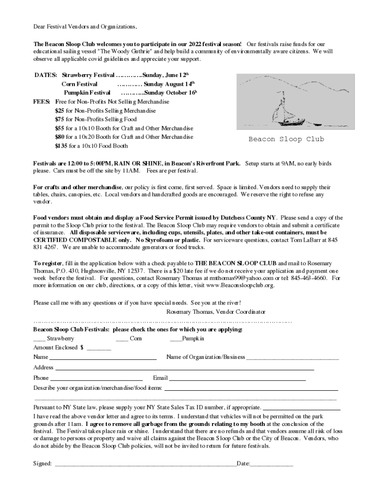 Dear Festival Vendors and Organizations, The Beacon Sloop Club welcomes you to participate in our 2022 festival season! Our festivals raise funds for our educational sailing-vessel \” The Woody