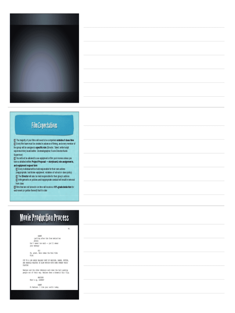 Film Expectations The majority of your films will need to be completed outside of class time Every film team must be created in advance of filming, and every member of the group will be assigned a