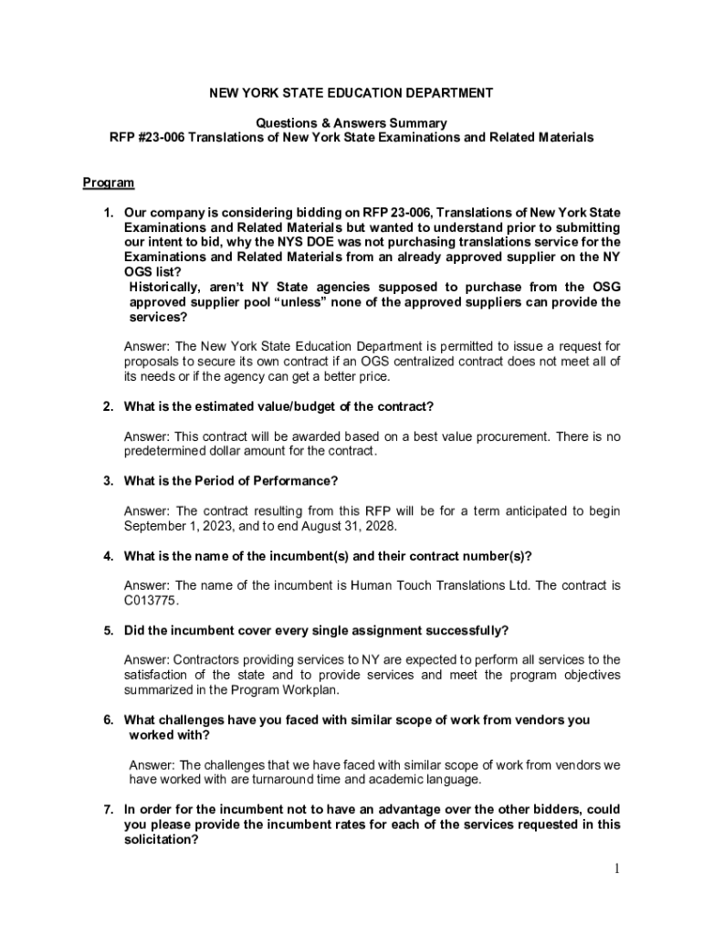 NEW YORK STATE EDUCATION DEPARTMENT Questions & Answers Summary RFP #23006 Translations of New York State Examinations and Related Materials Program 1. Our company is considering bidding on RFP 23006,