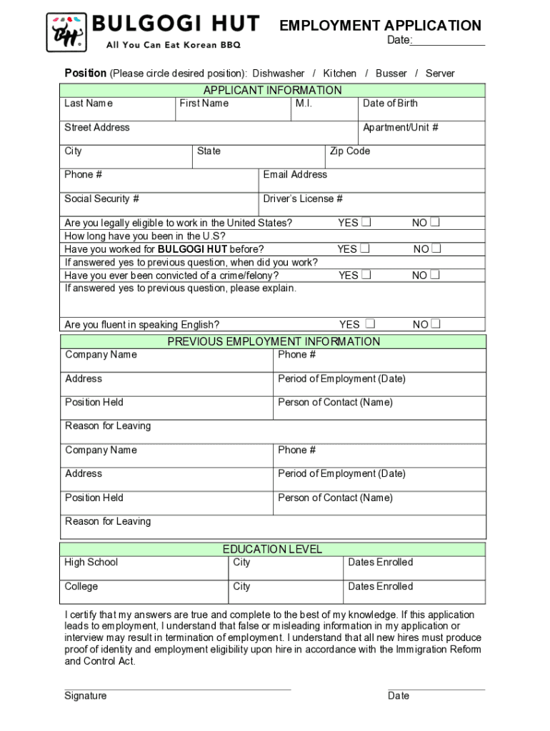 Position (Please circle desired position): Dishwasher / Kitchen / Busier / Server