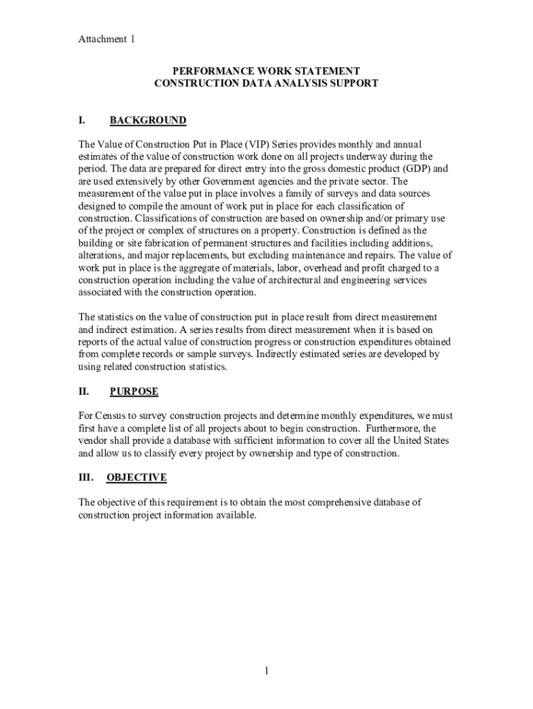 Attachment 1 PERFORMANCE WORK STATEMENT CONSTRUCTION DATA ANALYSIS SUPPORT I. Background Value of Construction Put in Place (VIP) Series provides monthly and annual estimates of the value of construction