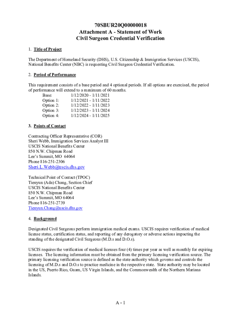 70SBUR20Q00000018 Attachment A Statement of Work Civil Surgeon Credential Verification 1. Title of Project The Department of Homeland Security (DHS), U.S. Citizenship & Immigration Services (USCIS),