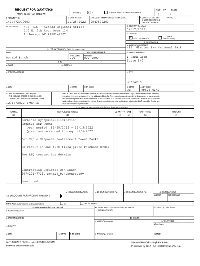 REQUEST FOR QUOTATIONXTHIS RFQ(THIS IS NOT AN ORDER)PAGE ISIS NOT A SMALL BUSINESS SET ASIDE1. REQUEST NO.2. DATE ISSUED3. REQUISITION/PURCHASE REQUEST NO.140P9723Q000311/25/202200405992035a. ISSUED