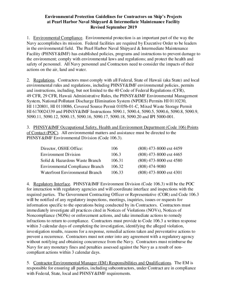 Environmental Protection Guidelines for Contractors on Ships Projects at Pearl Harbor Naval Shipyard & Intermediate Maintenance Facility Revised September 2019 1. Environmental Compliance. Environmental