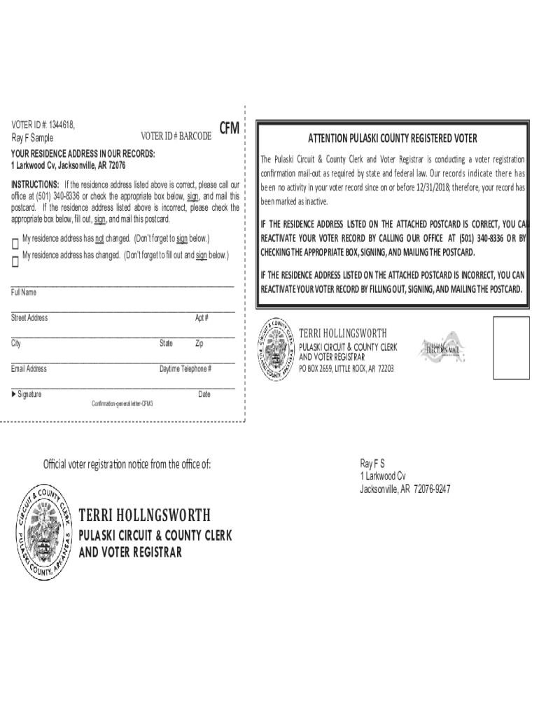 VOTER ID #: 1344618,Ray F SampleVOTER ID # BARCODECFMYOUR RESIDENCE ADDRESS IN OUR RECORDS: