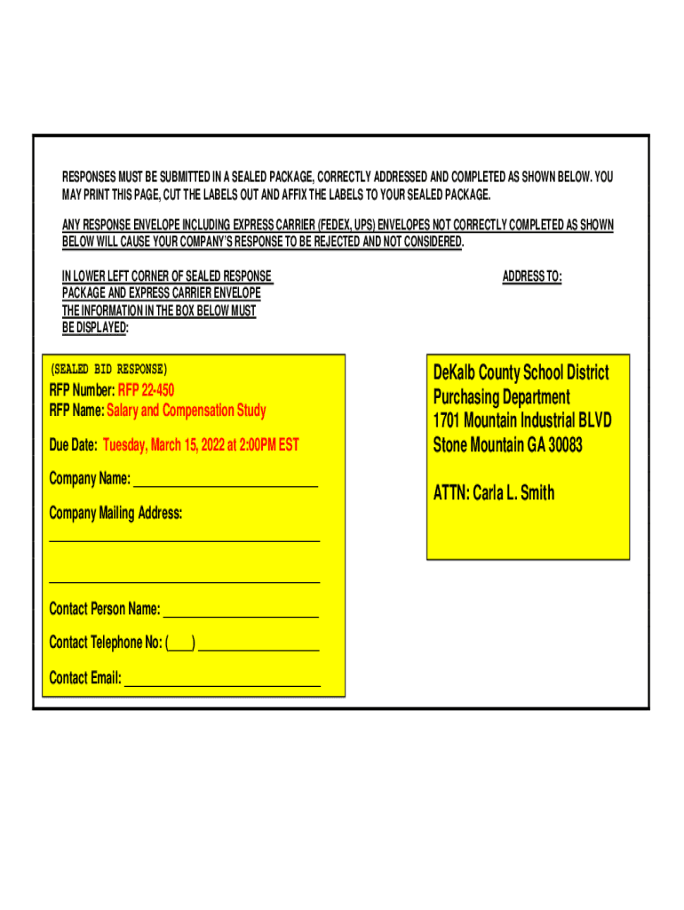 RESPONSES MUST BE SUBMITTED IN A SEALED PACKAGE, CORRECTLY ADDRESSED AND COMPLETED AS SHOWN BELOW. YOU MAY PRINT THIS PAGE, CUT THE LABELS OUT AND AFFIX THE LABELS TO YOUR SEALED PACKAGE. ANY RESPONSE
