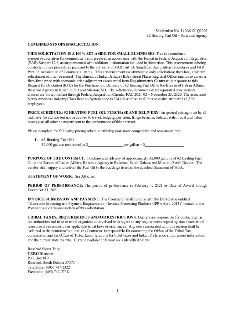 Solicitation No. 140A0121Q0008 #2 Heating Fuel Oil Rosebud Agency COMBINED SYNOPSIS/SOLICITATION: THIS SOLICITATION IS A 100% SEASIDE FOR SMALL BUSINESSES. This is a combined synopsis/solicitation