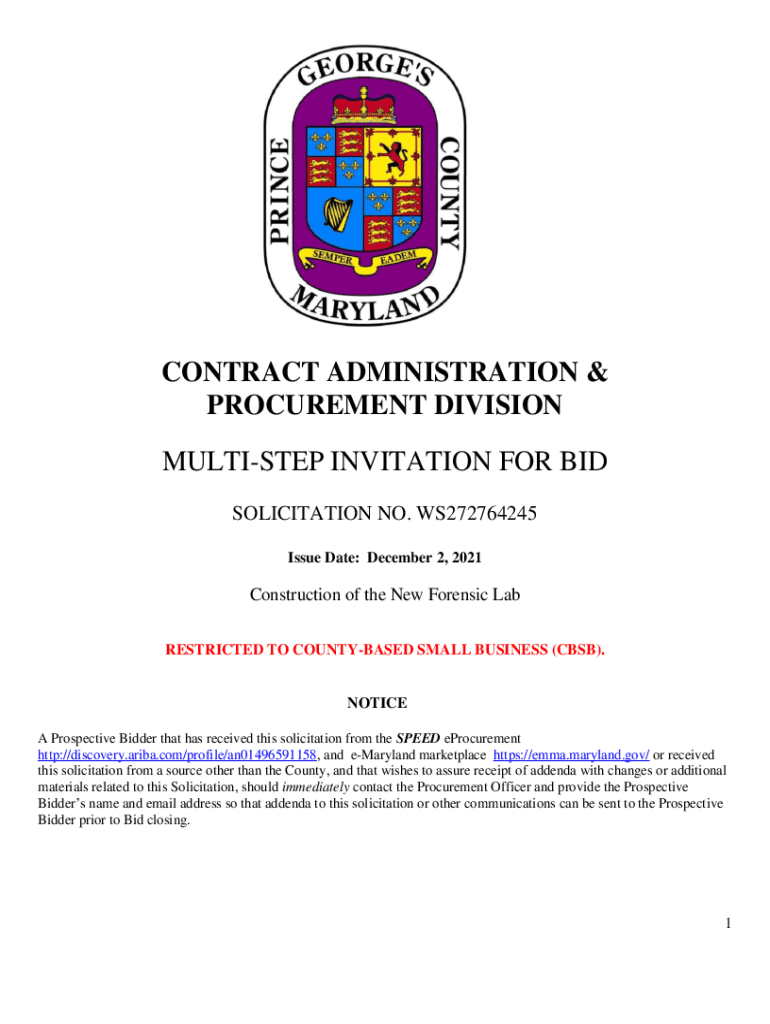 CONTRACT ADMINISTRATION & PROCUREMENT DIVISION MULTISTEP INVITATION FOR BID SOLICITATION NO. WS272764245 Issue Date: December 2, 2021Construction of the New Forensic Lab RESTRICTED TO COUNTYBASED