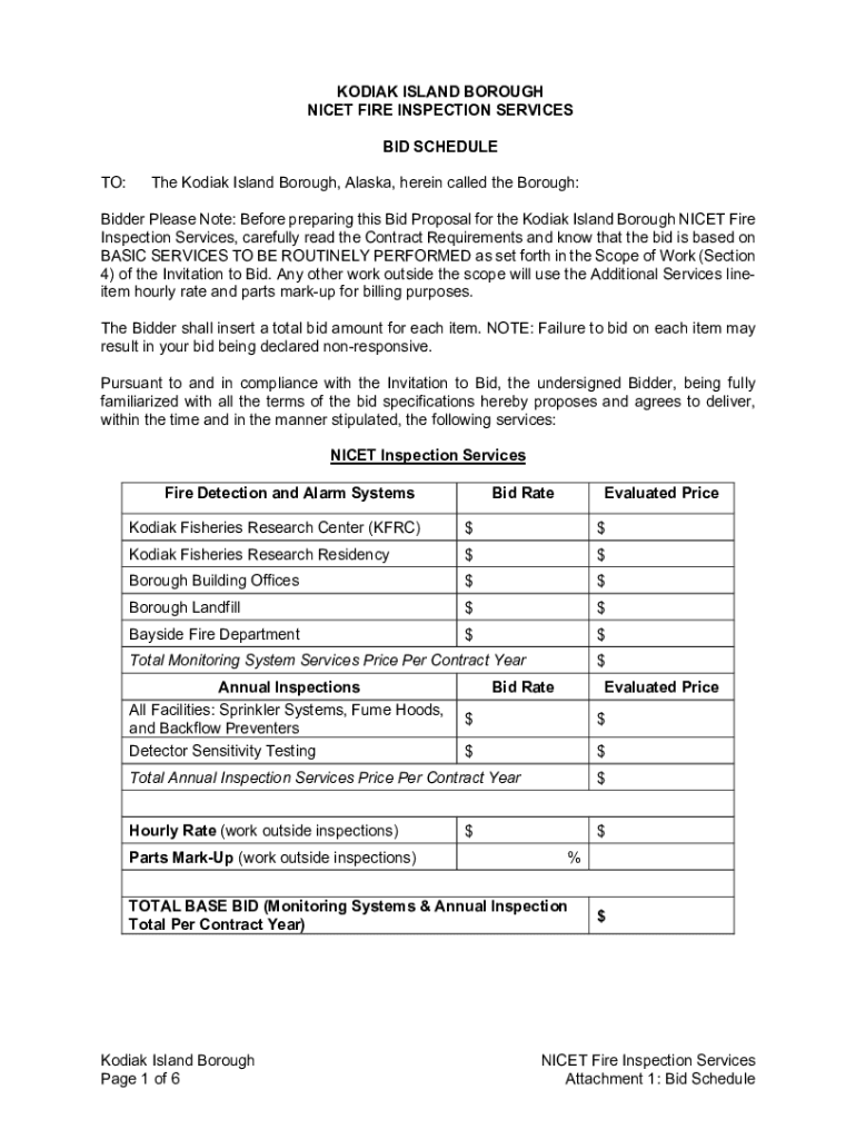 KODIAK ISLAND BOROUGH NICE FIRE INSPECTION SERVICES BID SCHEDULE TO:The Kodiak Island Borough, Alaska, herein called the Borough:Bidder Please Note: Before preparing this Bid Proposal for the Kodiak