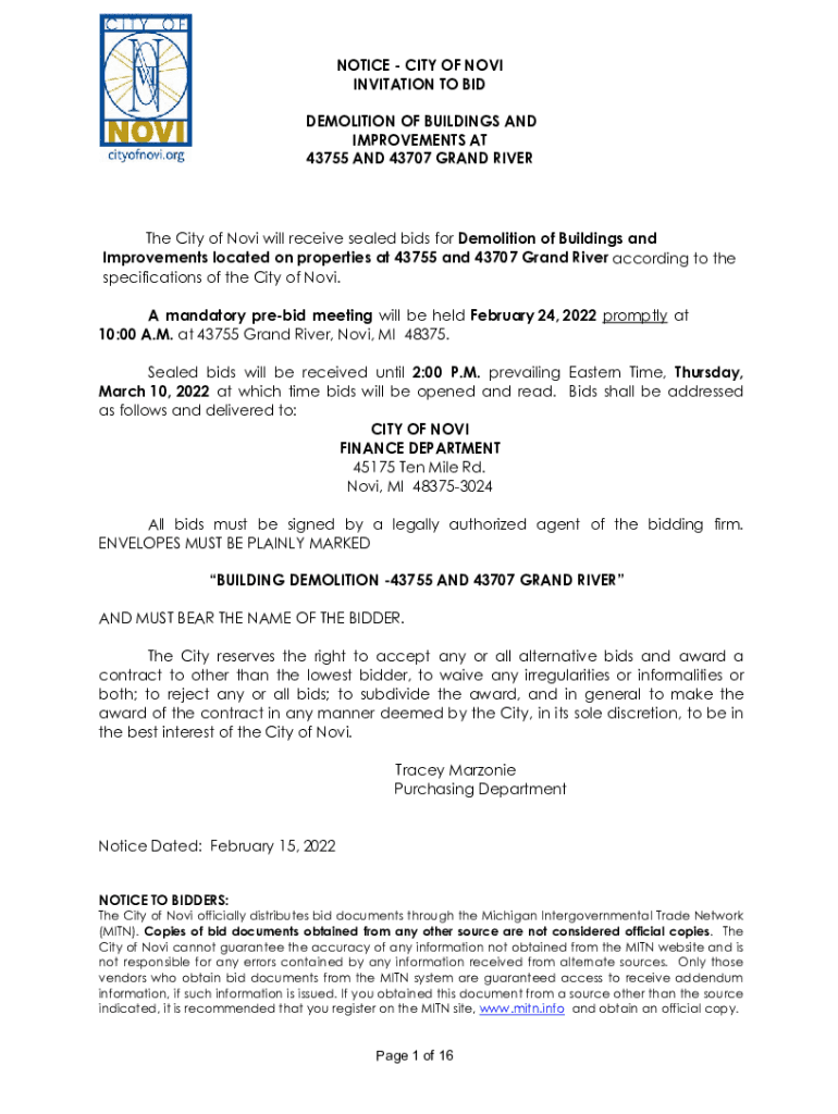 NOTICE CITY OF NOVA INVITATION TO BID DEMOLITION OF BUILDINGS AND IMPROVEMENTS AT 43755 AND 43707 GRAND Riverton City of Nova will receive sealed bids for Demolition of Buildings and Improvements