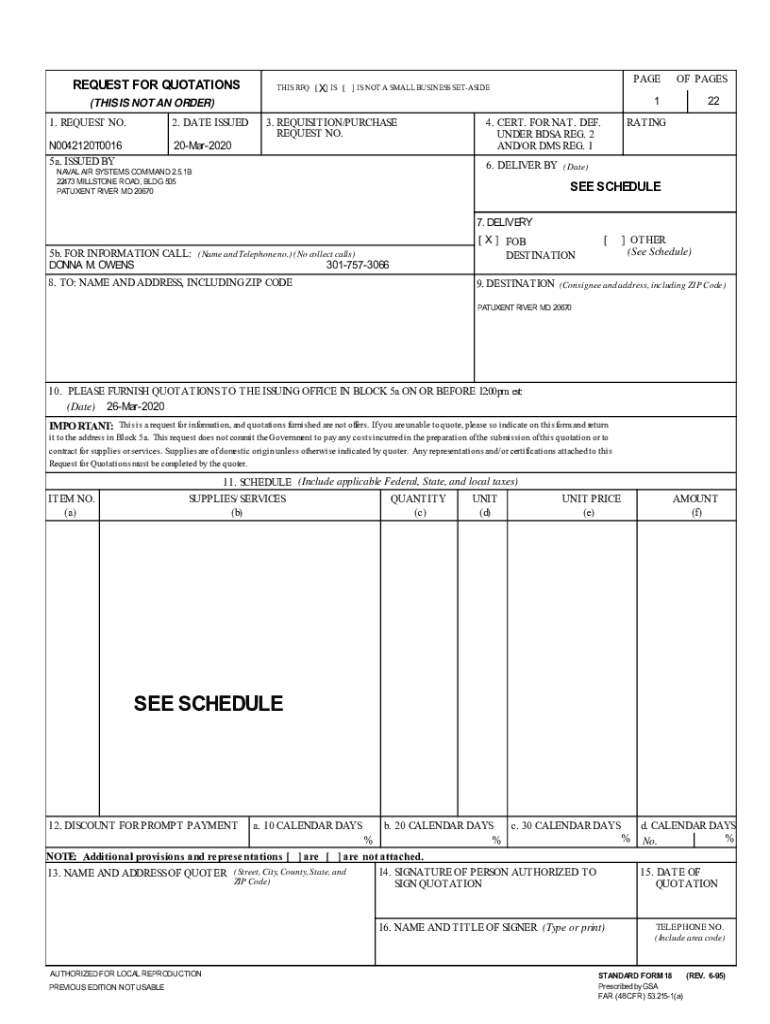REQUEST FOR QUOTATIONSPAGETHIS RFQ [X] IS [ ] IS NOT A SMALL BUSINESS SEASIDE PAGES1(THIS IS NOT AN ORDER) 1. REQUEST NO.2. DATE ISSUEDN0042120T0016 5a. ISSUED BY20Mar20203. REQUISITION/PURCHASE REQUEST