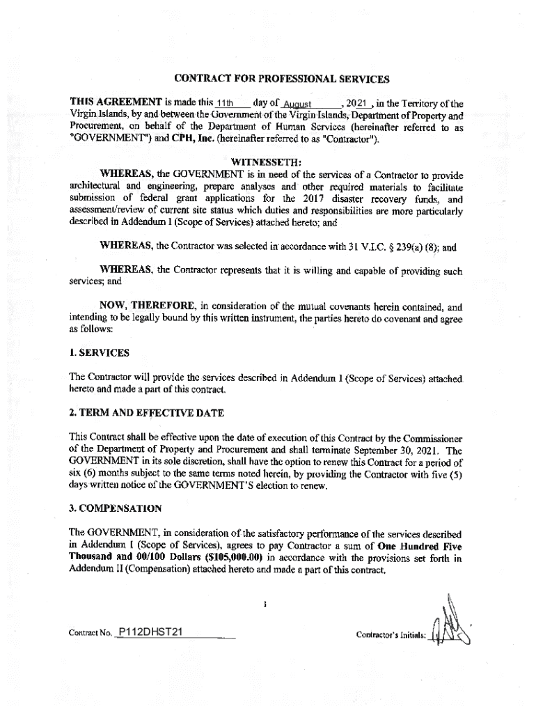 ___CONTRACT FOR PROFESSIONAL SERVICES THIS AGREEMENT is made this 11th day of August 21 in the Territory of the 20, Virgin Islands, by and between the Government of the Virgin Islands, Department