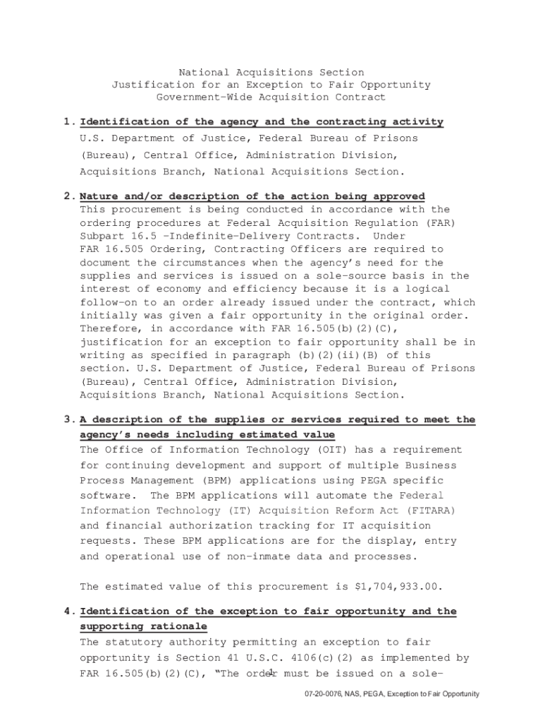 National Acquisitions Section Justification for an Exception to Fair Opportunity Governmentalize Acquisition Contract Identification of the agency and the contracting activity U.S. Department of Justice,