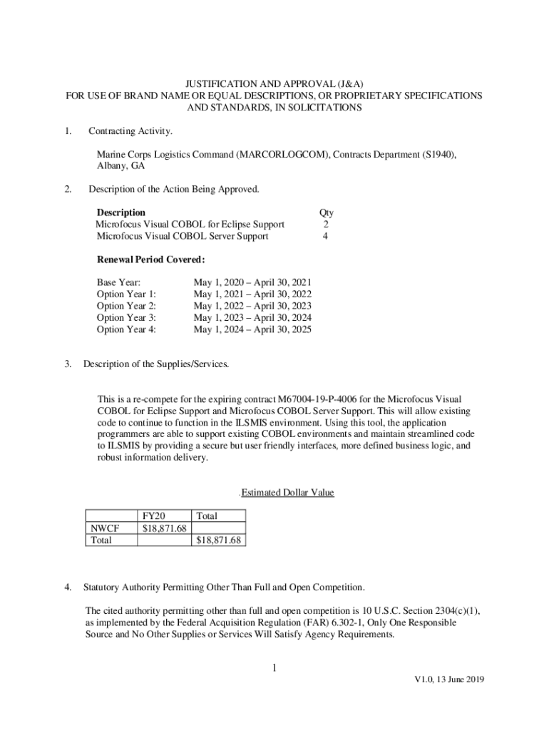 JUSTIFICATION AND APPROVAL (J&A) FOR USE OF BRAND NAME OR EQUAL DESCRIPTIONS, OR PROPRIETARY SPECIFICATIONS AND STANDARDS, IN SOLICITATIONS 1. Contracting Activity. Marine Corps Logistics Command