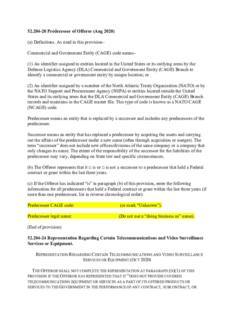 52.20420 Predecessor of Offer or (Aug 2020) (a) Definitions. As used in this provision Commercial and Government Entity (CAGE) code means (1) An identifier assigned to entities located in the United