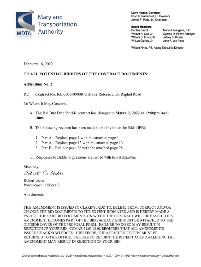 February 18, 2022, TO ALL POTENTIAL BIDDERS OF THE CONTRACT DOCUMENTS: Addendum No. 2 RE:Contract No. KH30350000R Offsite Reforestation Rachel Radio Whom It May Concern: A. The Bid Due Date for this