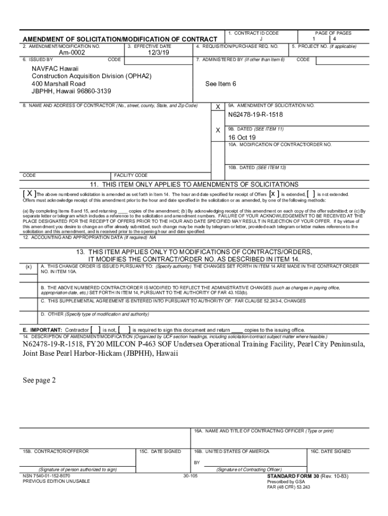 1. CONTRACT ID CODE 2. AMENDMENT/MODIFICATION NO.3. EFFECTIVE DATEAm0002PAGE OF PAGESJAMENDMENT OF SOLICITATION/MODIFICATION OF CONTRACT14. REQUISITION/PURCHASE REQ. NO.45. PROJECT NO. (If applicable)12/3/196.