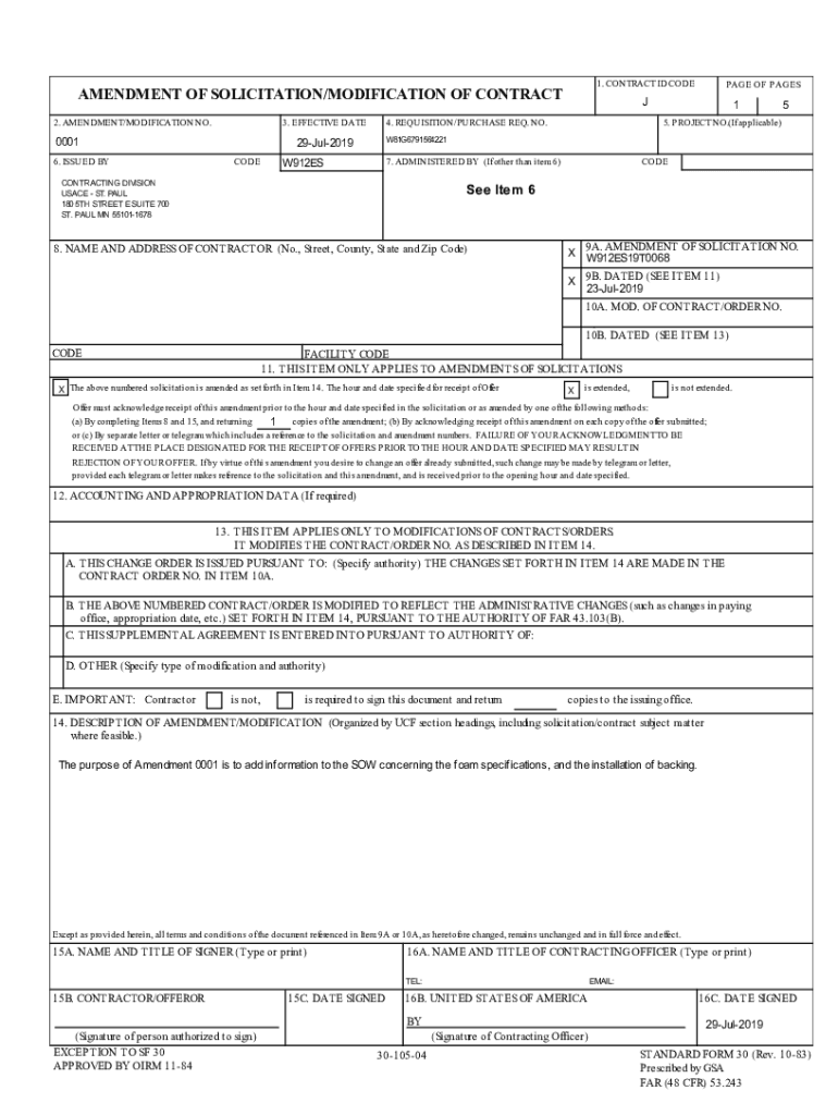 1. CONTRACT ID CODEPENDENT OF SOLICITATION/MODIFICATION OF CONTRACT 2. AMENDMENT/MODIFICATION NO.3. EFFECTIVE DATE0001 6. ISSUED BY4. REQUISITION/PURCHASE REQ. NO.155. P PROJECT NO.(If applicable)W81G679156422129Jul2019