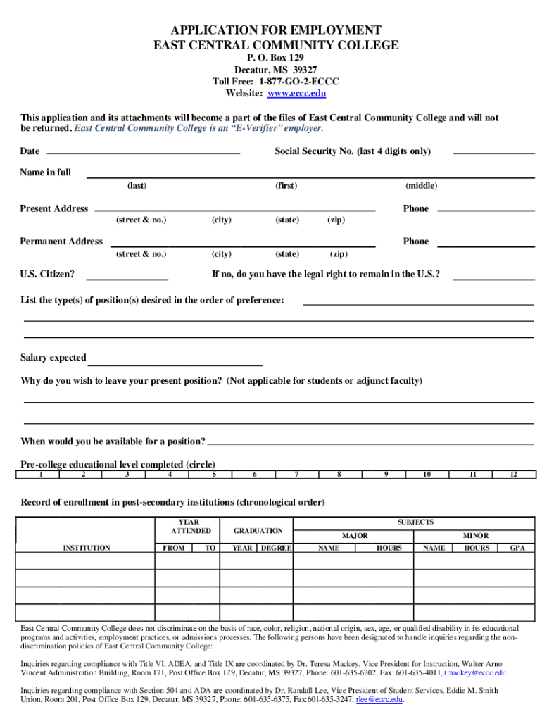 APPLICATION FOR EMPLOYMENT EAST CENTRAL COMMUNITY COLLEGE P. O. Box 129 Decatur, MS 39327 Toll Free: 1877GO2ECCC Website: www.eccc.edu This application and its attachments will become a part of the