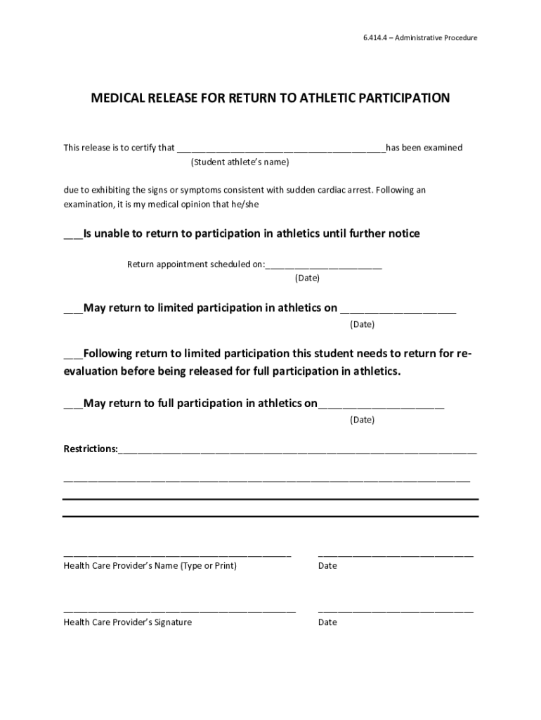 6.414.4 Administrative ProcedureMEDICAL RELEASE FOR RETURN TO ATHLETIC PARTICIPATIONThis release is to certify that ___has been examined (Student athletes name) due to exhibiting the signs or symptoms