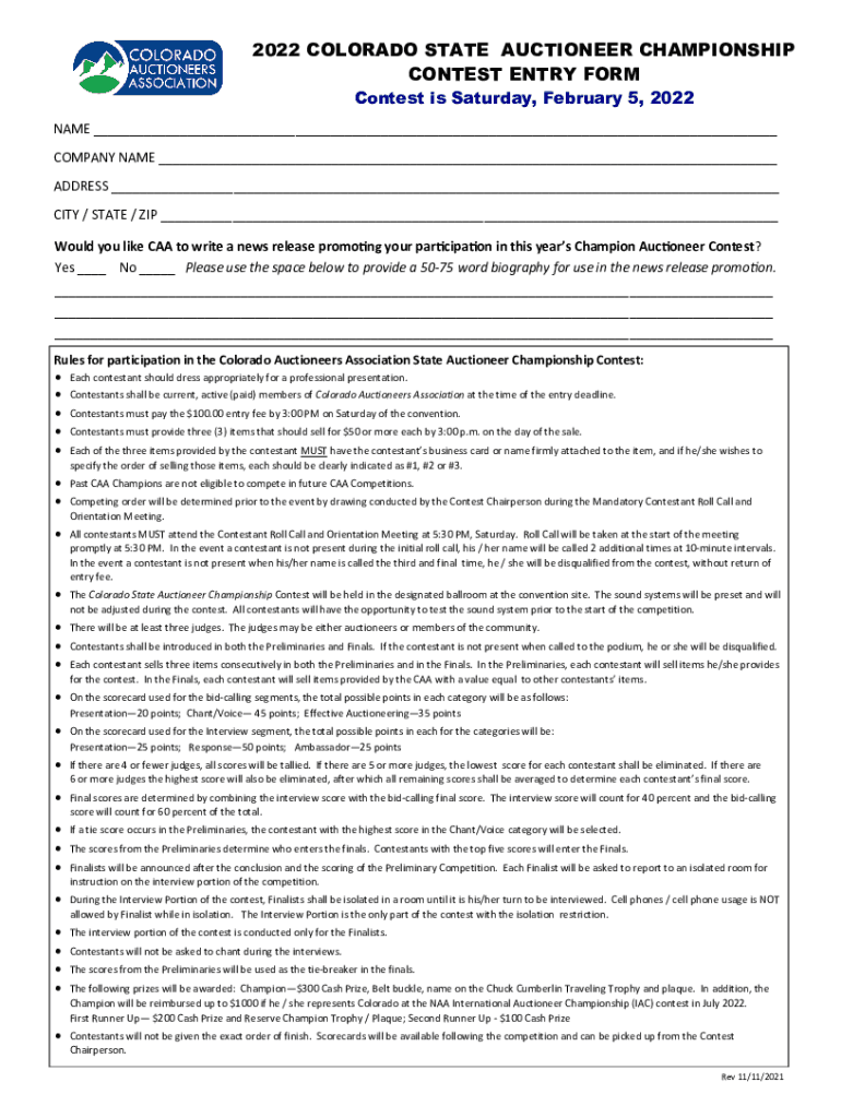 2022 COLORADO STATE AUCTIONEER CHAMPIONSHIP CONTEST ENTRY FORM Contest is Saturday, February 5, 2022NAME ___ COMPANY NAME ___ ADDRESS ___ CITY / STATE / ZIP ___ Would you like CAA to write a news