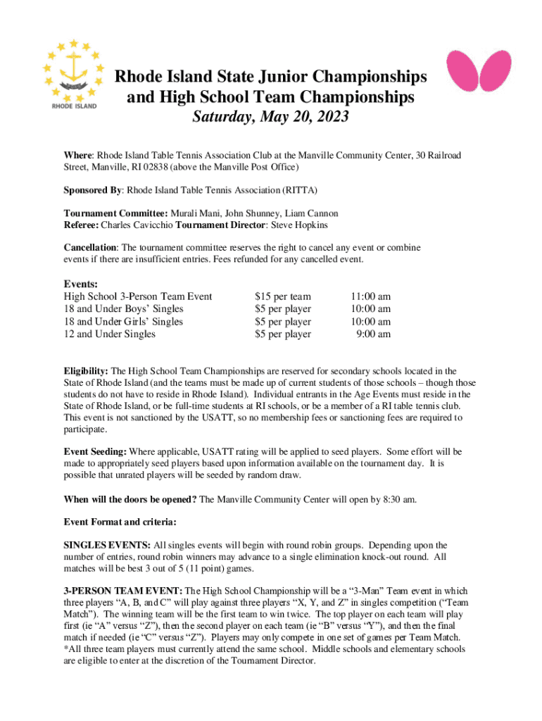 Rhode Island State Junior Championships and High School Team Championships Saturday, May 20, 2023, Where: Rhode Island Table Tennis Association Club at the Danville Community Center, 30 Railroad Street,