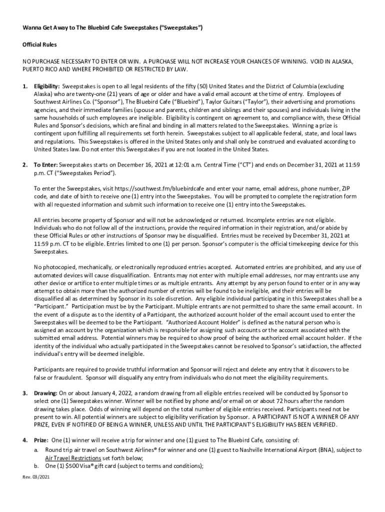 Want to Get Away to The Bluebird Café Sweepstakes (Sweepstakes) Official Rules NO PURCHASE NECESSARY TO ENTER OR WIN. A PURCHASE WILL NOT INCREASE YOUR CHANCES OF WINNING. VOID IN ALASKA, PUERTO