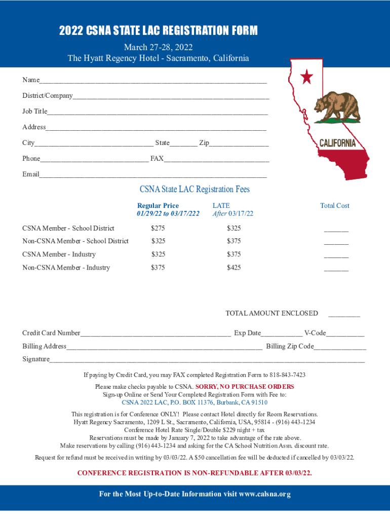 2022 CSA STATE LAC REGISTRATION FORM March 2728, 2022 The Hyatt Regency Hotel Sacramento, California Name___ District/Company___ Job Title___ Address___ City___ State___ Zip___ Phone___ FAX___ Email___CSNA