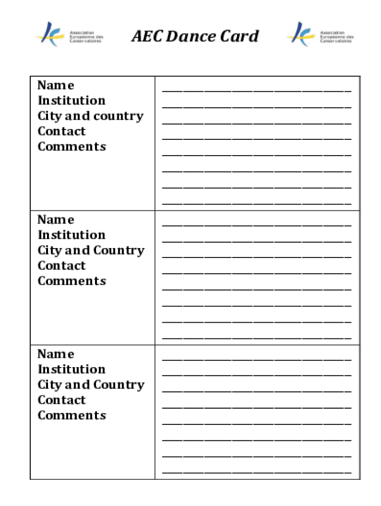 AEC Dance Card Name Institution City and country Contact Comments___ ___ ___ ___ ___ ___ ___ ___Name Institution City and Country Contact Comments___ ___ ___ ___ ___ ___ ___ ___Name Institution City