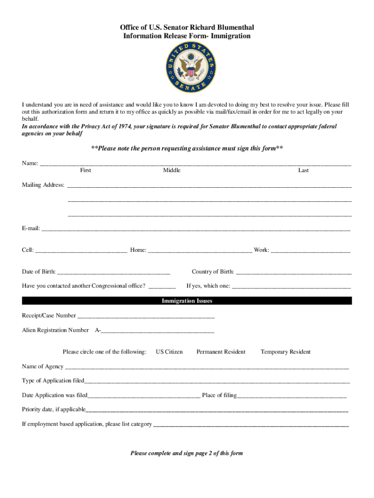 Office of U.S. Senator Richard Blumenthal Information Release Form Immigration understand you are in need of assistance and would like you to know I am devoted to doing my best to resolve your issue.