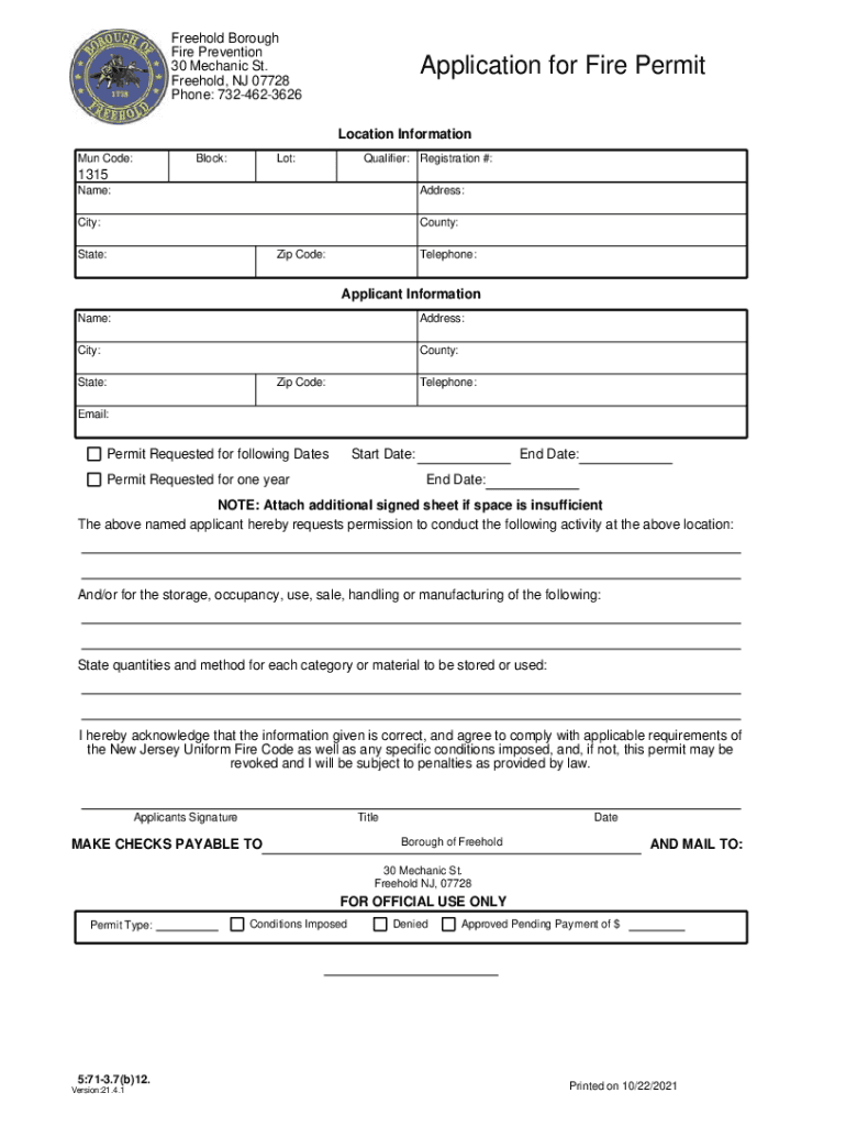 Freehold Borough Fire Prevention 30 Mechanic St. Freehold, NJ 07728 Phone: 7324623626Application for Fire Permit Location Information Code:Block:Lot:Qualifier: Registration #:1315 Name:Address:City:County:State:Zip
