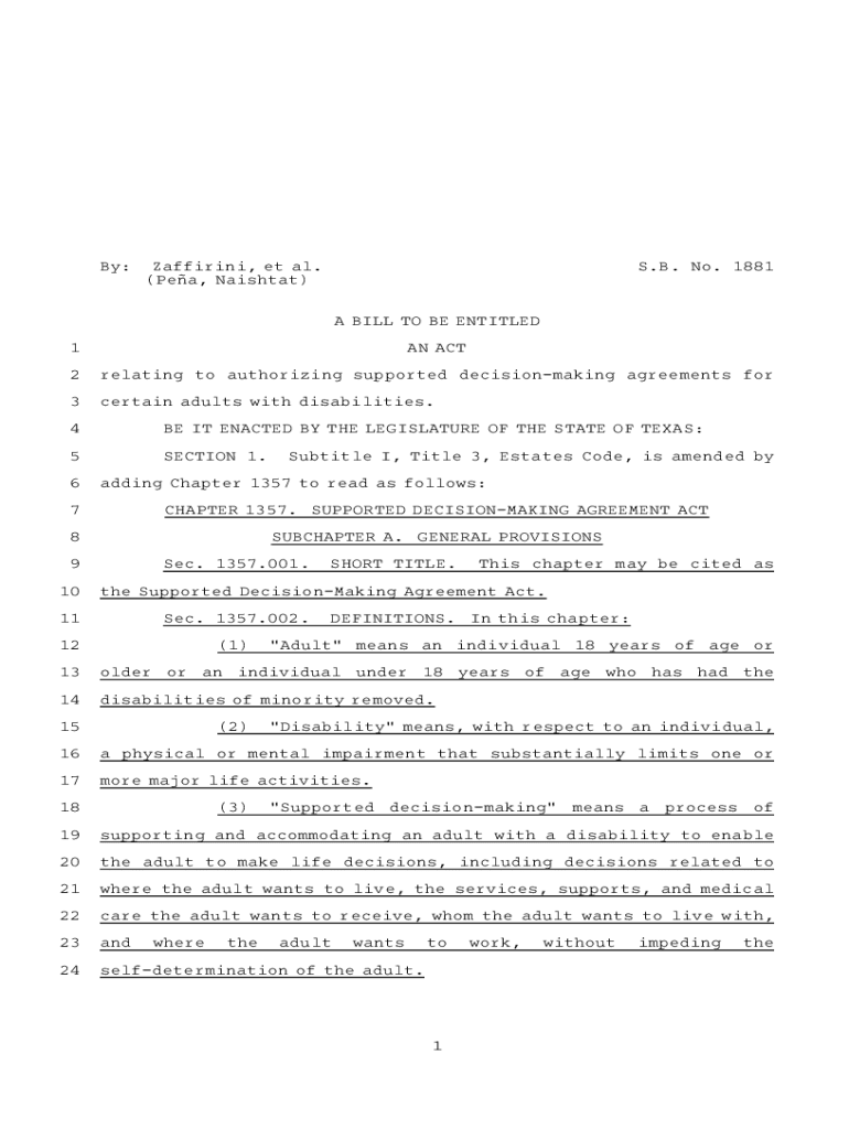 By:AAZaffirini, et al. (Pea, Nashua)S.B.ANO. A1881A BILL TO BE ENTITLED 1AN ACT2relating to authorizing supported decision-making agreements for3certain adults with disabilities.4BE IT ENACTED BY