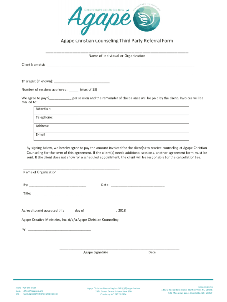 Rooted and built up in Him Agape Christian Counseling Third Party Referral Form___ Name of Individual or OrganizationClient Name(s): ___ ___ Therapist (if known): ___ Number of sessions approved: