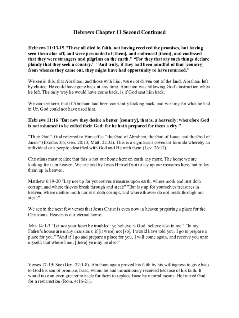 Hebrews Chapter 11 Second Continued Hebrews 11:1315 \” These all died in faith, not having received the promises, but having seen them afar off, and were persuaded of [them], and embraced [them],