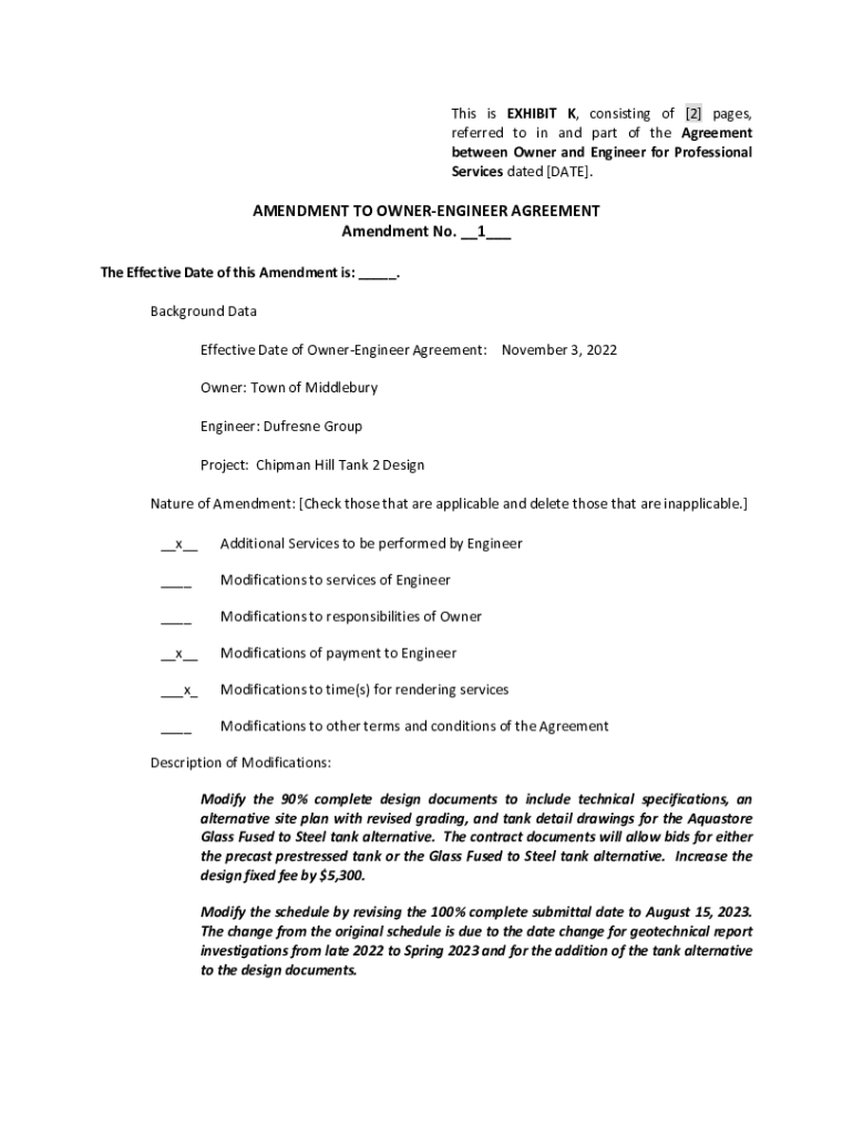 This is EXHIBIT K, consisting of [2] pages, referred to in and part of the Agreement between Owner and Engineer for Professional Services dated [DATE].AMENDMENT TO OVERENGINEER AGREEMENT Amendment