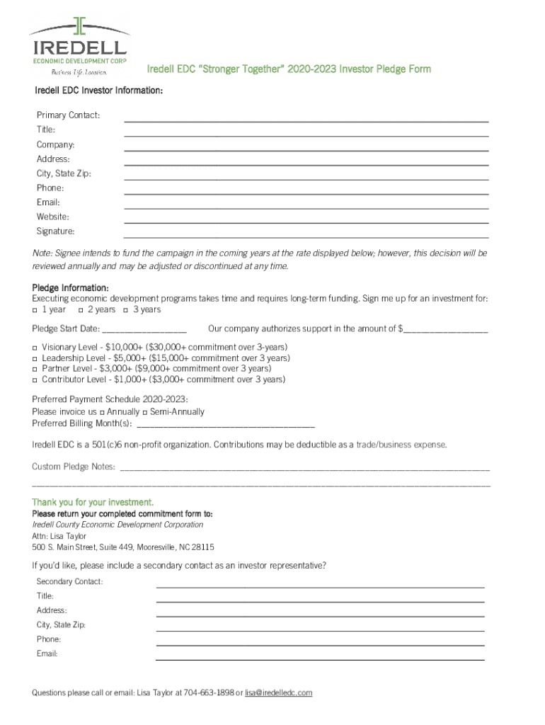Iredell EDC Stronger Together 20202023 Investor Pledge Form Iredell EDC Investor Information: Primary Contact: Title: Company: Address: City, State Zip: Phone: Email: Website: Signature: Note: Signee