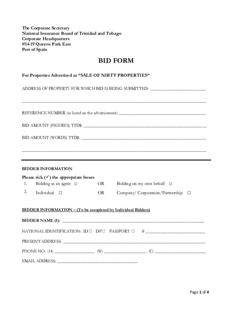 The Corporate Secretary National Insurance Board of Trinidad and Tobago Corporate Headquarters #1419 Queens Park East Port of Spain BID FORM For Properties Advertised as SALE OF NI BTT PROPERTIES