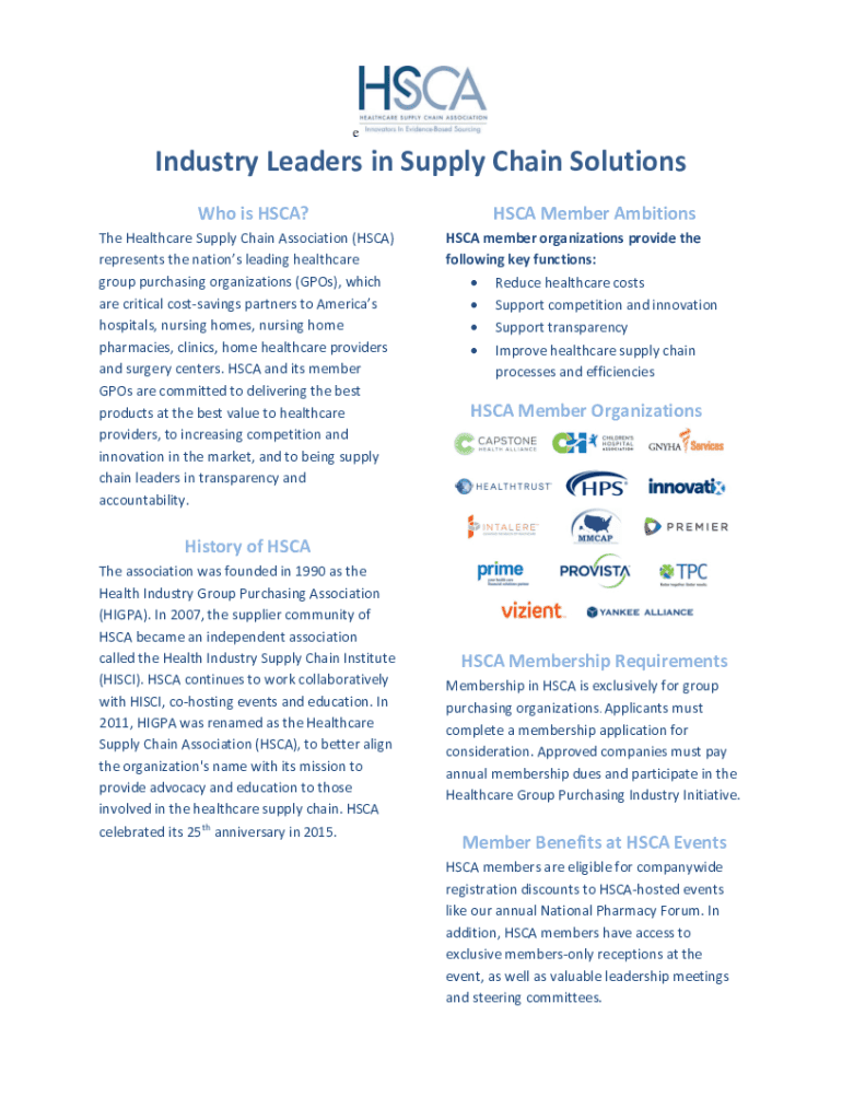 Industry Leaders in Supply Chain Solutions Who are HCA? The Healthcare Supply Chain Association (HCA) represents the nations leading healthcare group purchasing organizations (GPO's), which are critical