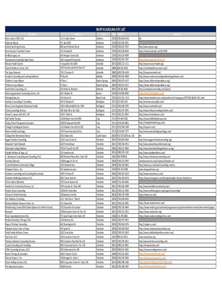 Site Name Marc Lewis, LCSW, LLC Adrienne Macon Alcohol and Drug Services New Horizons Treatment Center RedBud Legacy, Inc. Southwestern Randolph High School Mission Health System Summit Wellness Center,