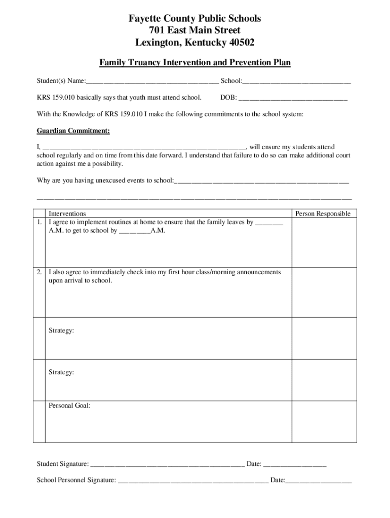 Fayette County Public Schools 701 East Main Street Lexington, Kentucky 40502 Family Truancy Intervention and Prevention Plan Student(s) Name:___ School:___ MRS 159.010 basically says that youth must