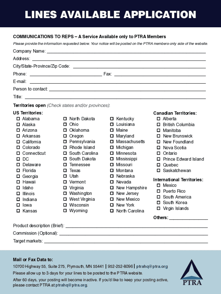 LINES AVAILABLE APPLICATION COMMUNICATIONS TO REPS A Service Available only to PETRA Members Please provide the information requested below. Your notice will be posted on the PETRA members only side