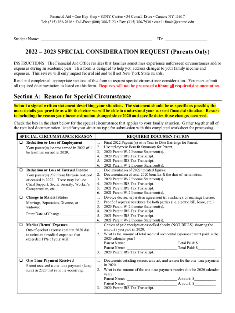 Financial Aid One Hop Shop SUN Canton 34 Cornell Drive Canton, NY 13617 Tel: (315) 3867616 Toll-free: (800) 3887123 Fax: (315) 3867930 email: finaid@canton.eduStudent Name:ID:2022 2023 SPECIAL CONSIDERATION
