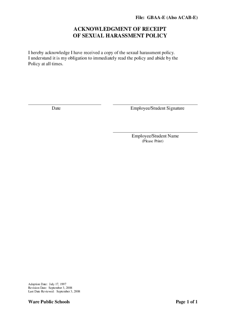 File: GB AAE (Also ACAE)ACKNOWLEDGMENT OF RECEIPT OF SEXUAL HARASSMENT POLICY I hereby acknowledge I have received a copy of the sexual harassment policy. I understand it is my obligation to immediately