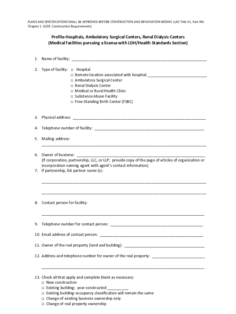 PLANS AND SPECIFICATIONS SHALL BE APPROVED BEFORE CONSTRUCTION AND RENOVATION BEGINS. (LAC Title 51, Part XIX. Chapter 1. 103. Construction Requirements)ProfileHospitals, Ambulatory Surgical Centers,