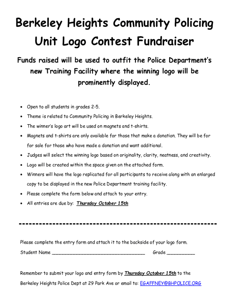 Berkeley Heights Community Policing Unit Logo Contest Fundraiser Funds raised will be used to outfit the Police Departments new Training Facility where the winning logo will be prominently displayed.