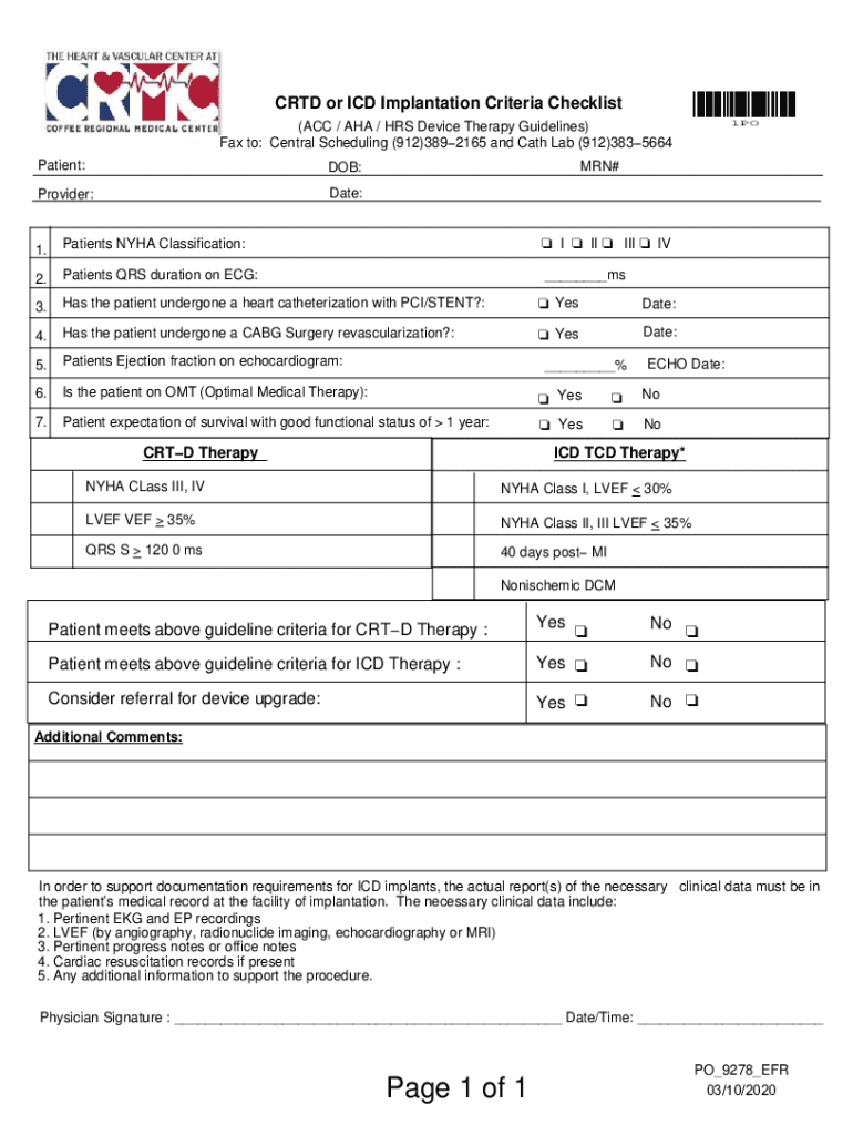 CRT or ICD Implantation Criteria Checklist×1PO×r 1PO(ACC / AHA / HRS Device Therapy Guidelines) Fax to: Central Scheduling (912)3892165 and Path Lab (912)3835664 Patient:DOB:Provider:Date:MAN#1.