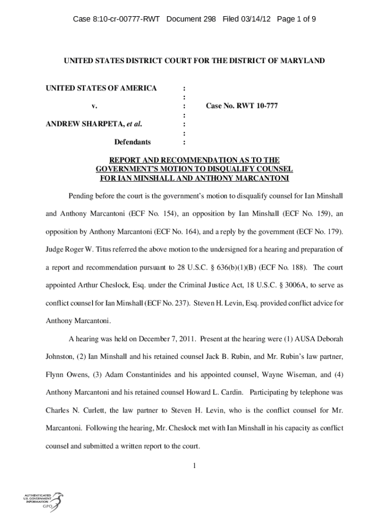 Case 8:10cr00777RWT Document 298 Filed 03/14/12-Page 1 of 9UNITED STATES DISTRICT COURT FOR THE DISTRICT OF MARYLANDUNITED STATES OF AMERICA