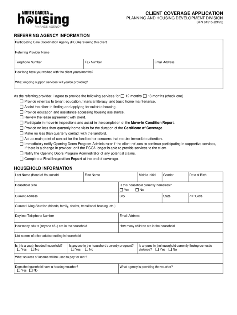 CLIENT COVERAGE APPLICATION PLANNING AND HOUSING DEVELOPMENT DIVISION SON 61515 (03/23)REFERRING AGENCY INFORMATION Participating Care Coordination Agency (PCC) referring this client Referring Provider
