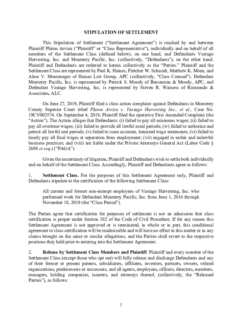 Get the free STIPULATION OF SETTLEMENT